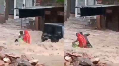 तेज बहाव में बाइक सहित फंसे बुजुर्ग, बेटा-बहू; समय रहते बचाई गई जान