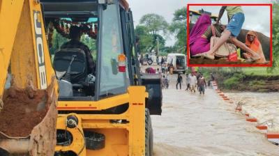 जेसीबी की बकेट से गर्भवती को कराया बहता नाला पार, दूसरी ओर खड़ी थी एम्बुलेंस