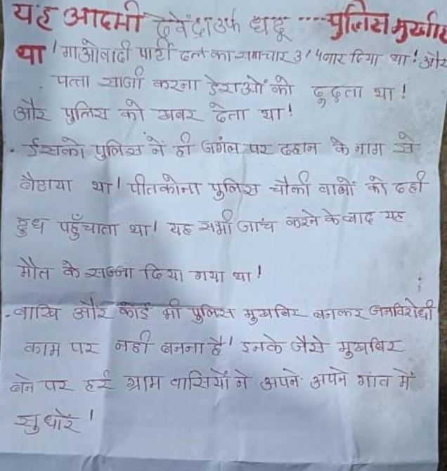 दूसरे पर्चे में नक्सलियों ने पुलिस पर तीखे आरोप लगाए हैं। इसमें कहा गया है कि पुलिस गरीबों को आपस में लड़वाकर मरवाती है। पुलिस साम्राज्यवादी और सामंती ताकतों की रक्षक है। वह गरीबों का शोषण करती है, उन्हें विस्थापित कर उनके जीवन को बर्बाद करती है। साथ ही ग्रामीणों को चेताया गया है कि वे पुलिस से दूरी बनाए रखें और उसके बहकावे में न आएं। चौरिया और आसपास के गांवों में घटना के बाद से ही भय का वातावरण है। ग्रामीण खुलकर कुछ भी कहने से बच रहे हैं। उन्हें आशंका है कि नक्सली कहीं उन्हें भी मुखबिर बताकर निशाना न बना दें।