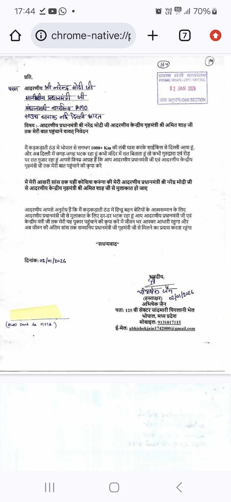 नई दिल्ली। मध्यप्रदेश की राजधानी भोपाल से जुड़े बहुचर्चित शारिक मछली मामले में अब प्रधानमंत्री कार्यालय (पीएमओ) ने संज्ञान ले लिया है। शिकायतकर्ता अभिषेक जैन द्वारा की गई शिकायत को पीएमओ ने गृह मंत्रालय से जुड़े संयुक्त सचिव स्तर के वरिष्ठ अधिकारी को सौंप दिया है। इस घटनाक्रम के बाद मामले की गंभीरता और बढ़ गई है तथा केंद्रीय स्तर पर निष्पक्ष जांच की उम्मीद जगी है। प्राप्त जानकारी के अनुसार, पीएमओ ने यह शिकायत गृह मामलों से संबंधित संयुक्त सचिव डॉ. आर.के. मित्रा को अग्रेषित की है। माना जा रहा है कि प्राथमिक जांच और तथ्यों के परीक्षण के बाद गृह मंत्रालय द्वारा आगे की आवश्यक कार्रवाई की जाएगी।