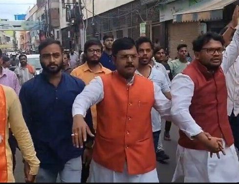 नगर निगम पर प्रदर्शन, बैरिकेडिंग के बीच कार्यकर्ताओं ने किया हनुमान चालीसा का पाठ