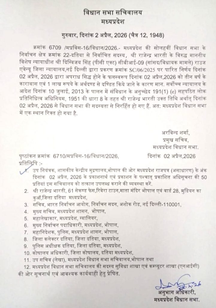 MP News: मध्य प्रदेश में राजनीतिक हलचल तेज हो गई है. एफडी घोटाला मामले में कोर्ट से 3 साल की सजा होने के बाद दतिया कांग्रेस विधायक राजेंद्र भारती की विधानसभा सदस्यता को खत्म कर दिया गया. विधानसभा सचिवालय ने उनकी सदस्यता खत्म करने का आदेश जारी किया है और दतिया विधानसभा सीट को रिक्त घोषित कर दिया.