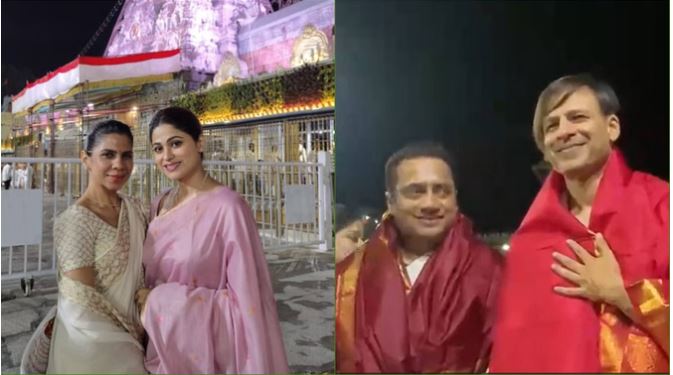 भक्ति के रंग में रंगे नजर आए सितारे तिरुपति की पवित्र पहाड़ियों पर स्थित इस प्राचीन मंदिर में शमिता शेट्टी और विवेक ओबेरॉय पूरी तरह पारंपरिक अंदाज़ में दिखाई दिए। शमिता ने इस खास मौके के लिए गुलाबी रंग की साड़ी का चुनाव किया था, जिसमें उनकी सादगी ने फैंस का दिल जीत लिया। वहीं, विवेक ओबेरॉय ने मंदिर की मर्यादा का पालन करते हुए सफेद धोती और लाल रंग का अंगवस्त्र धारण किया। सोशल मीडिया पर उनकी तस्वीरें तेजी से वायरल हो रही हैं, जिसमें वे मंदिर परिसर में शांति और सुकून के पल बिताते नजर आ रहे हैं।