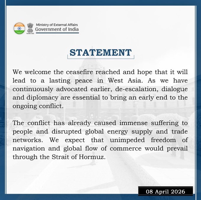 भारत: अमेरिका और ईरान के बीच जारी जंग अब खत्म हो गई है। दोनों देशों के बीच दो हफ्तों के बीच सीजफायर पर सहमति बन गई है। अब भारत की इस प्रतिक्रिया सामने आई है। भारत ने इस सीजफायर का स्वागत किया है। सरकार ने उम्मीद जताई है कि यह अस्थायी सीजफायर पश्चिम एशिया में स्थायी शांति की दिशा में एक अहम कदम साबित होगा।
